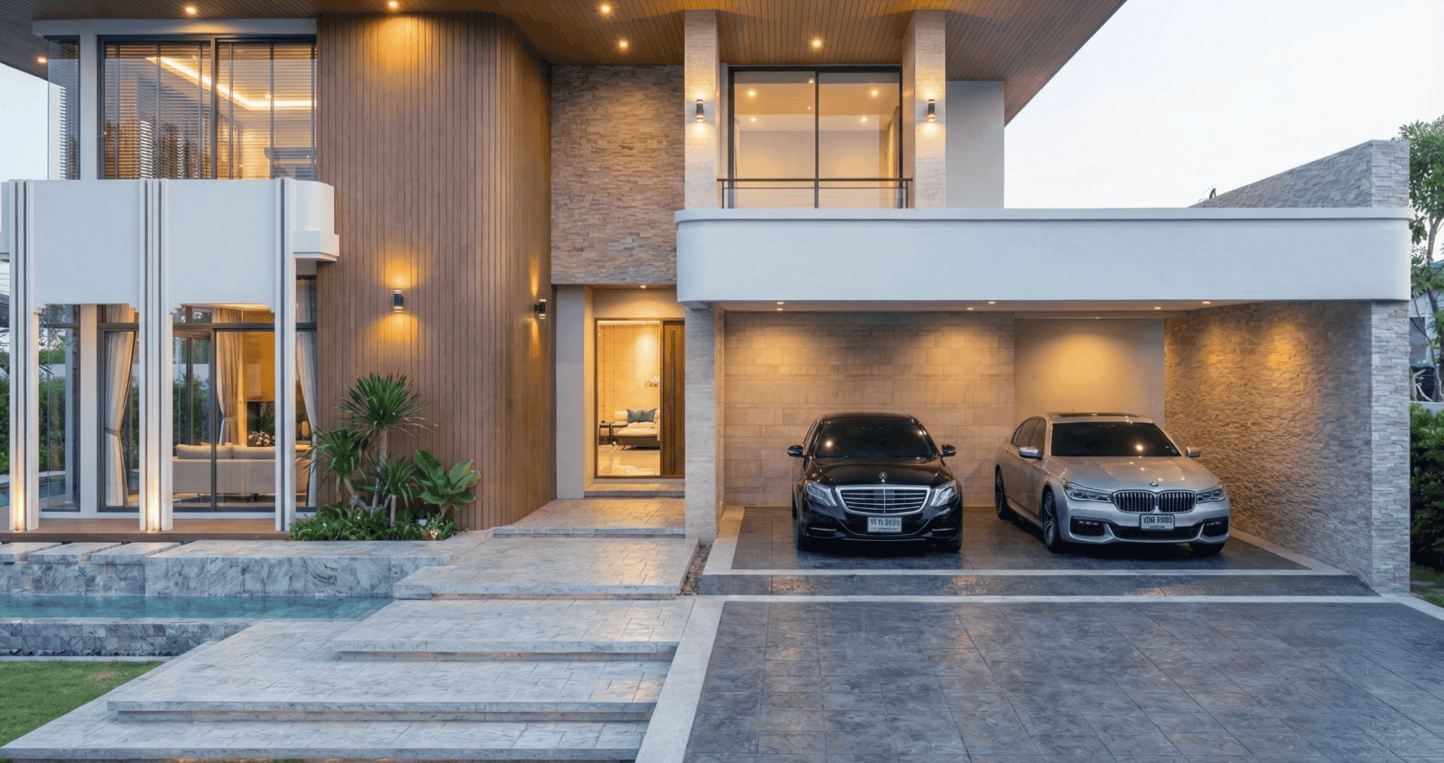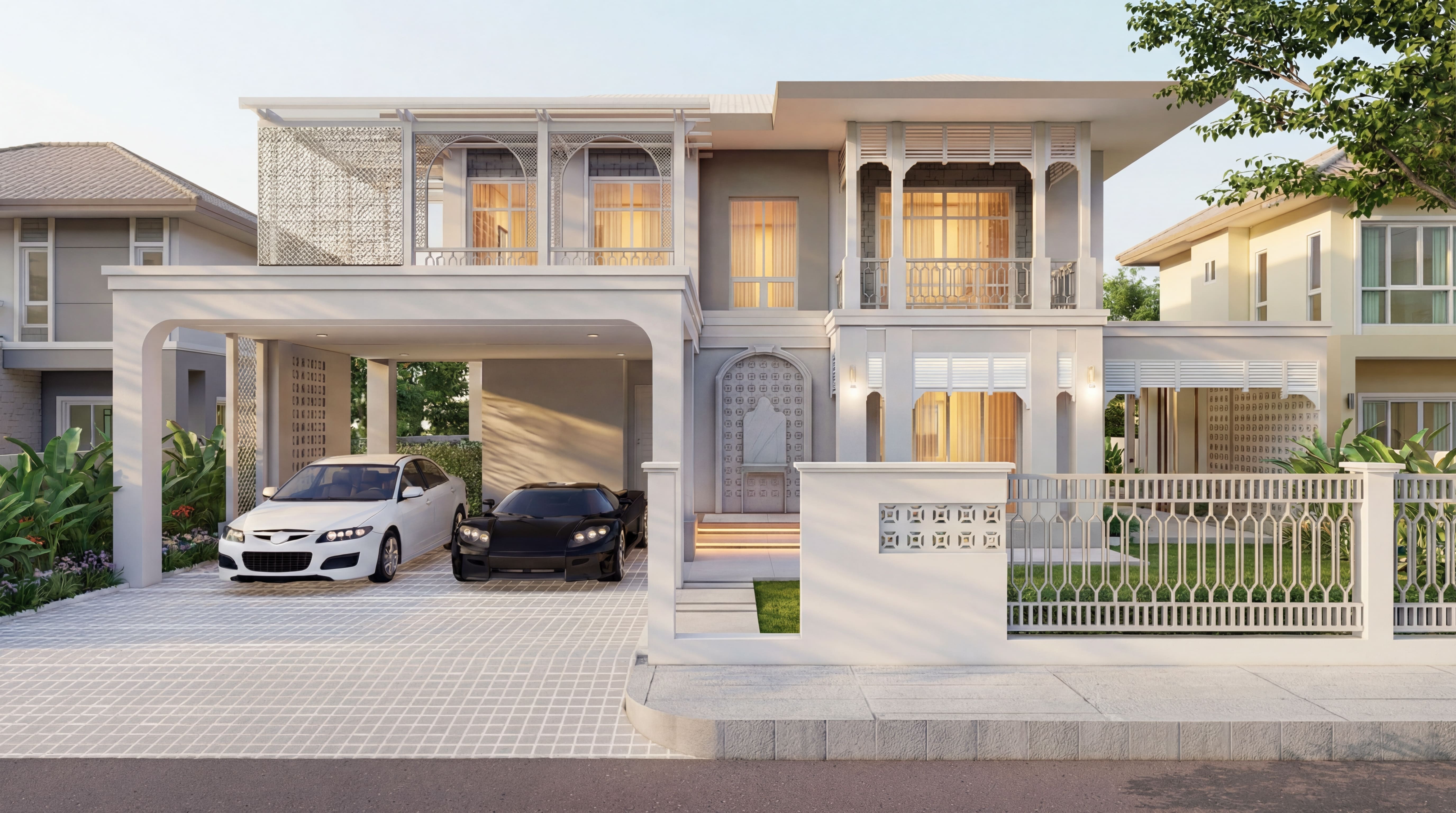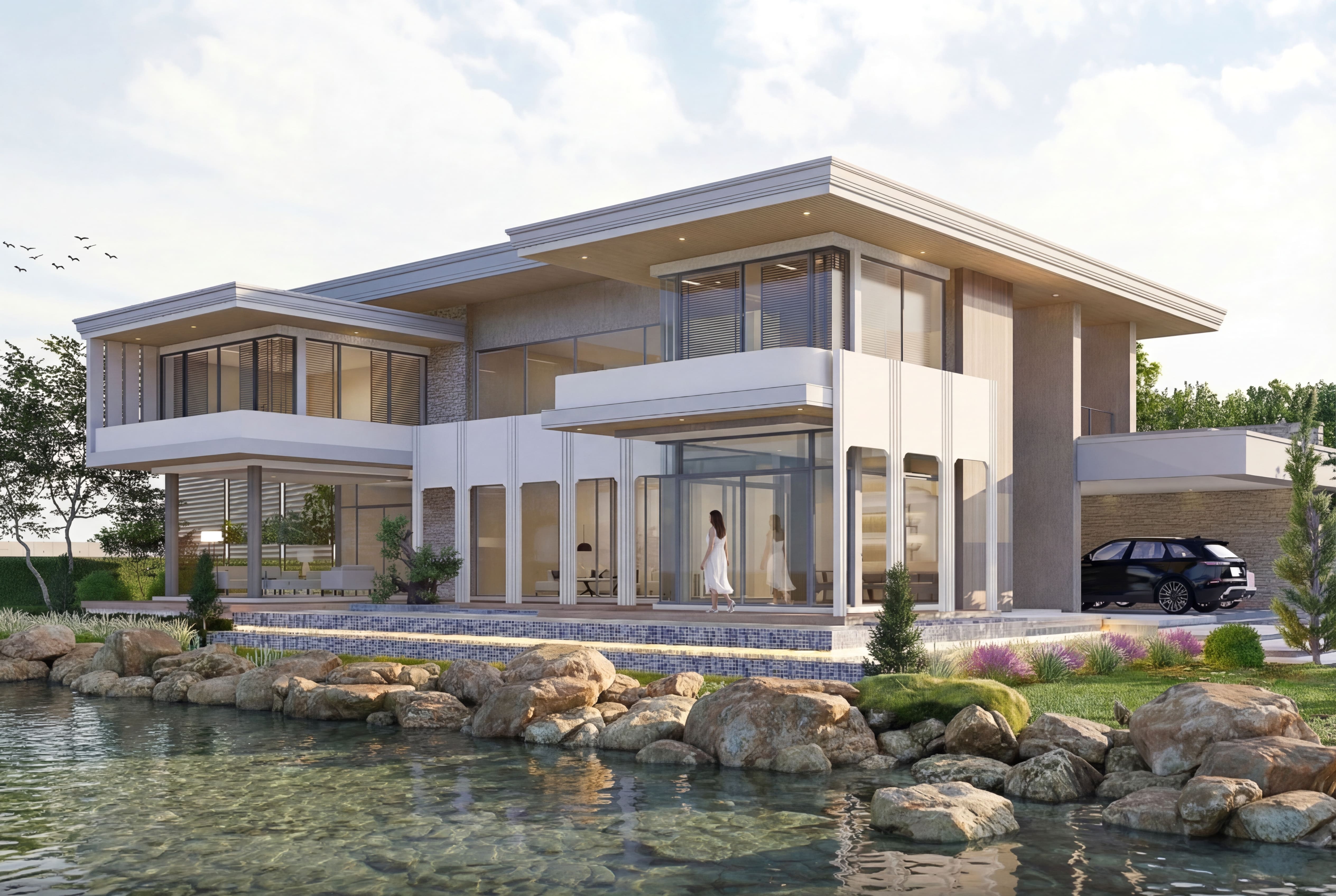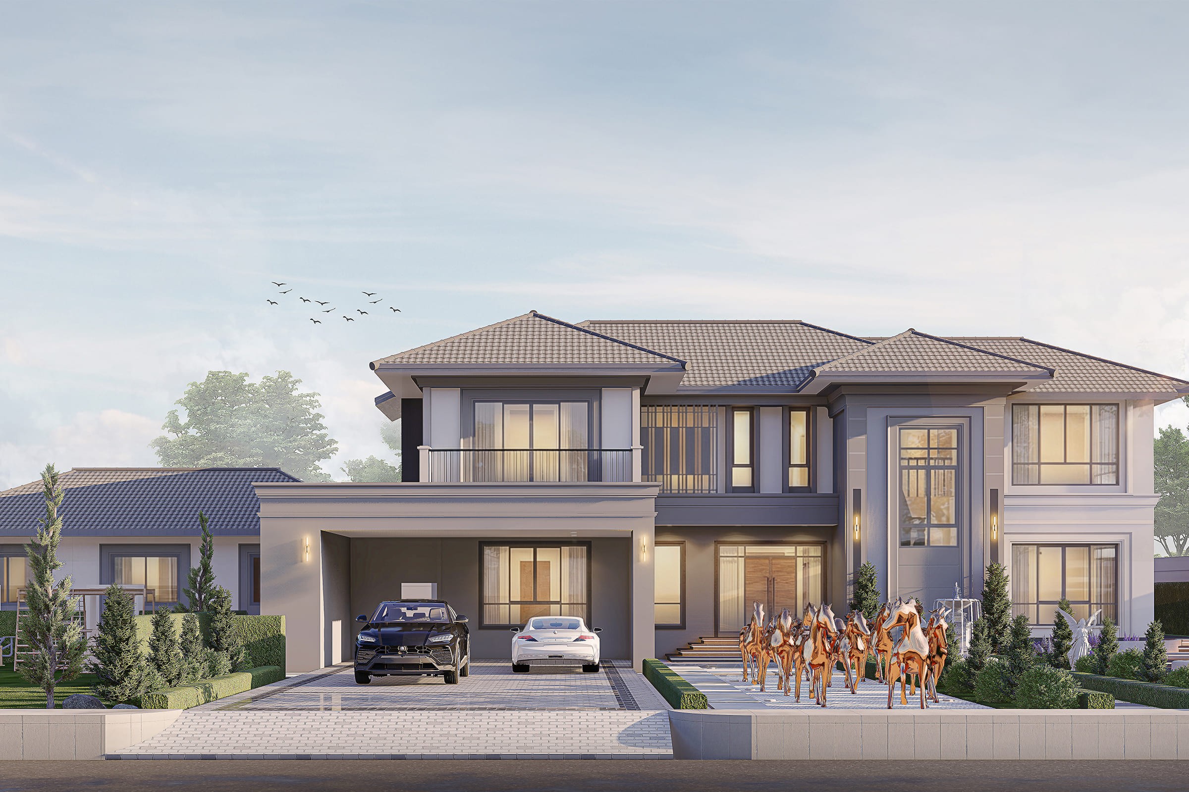 This residence is designed in a Modern Classic architectural style, blending timeless proportions with contemporary detailing. The overall massing emphasizes symmetry and balance, creating a dignified and elegant façade that reflects long-lasting architectural value.