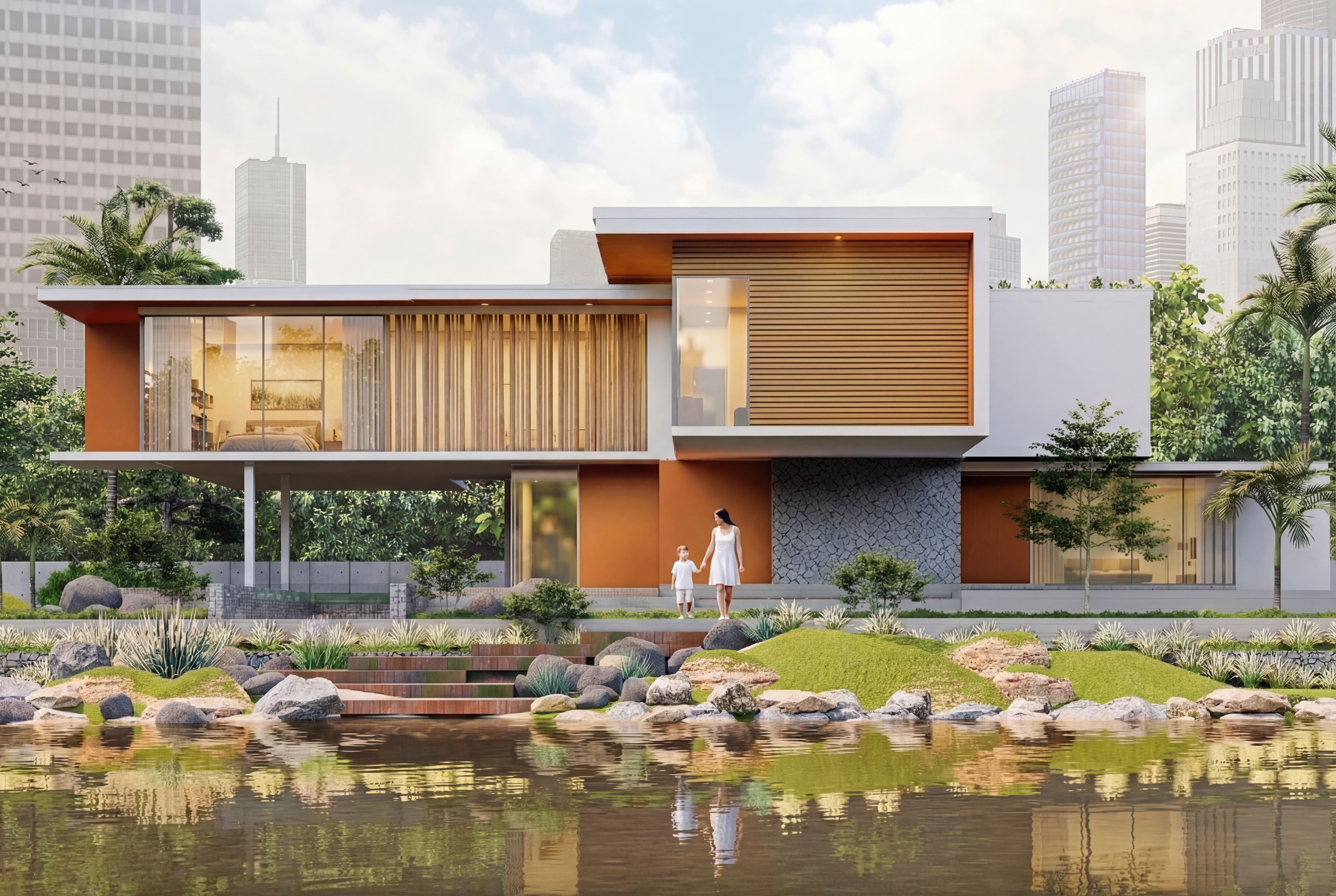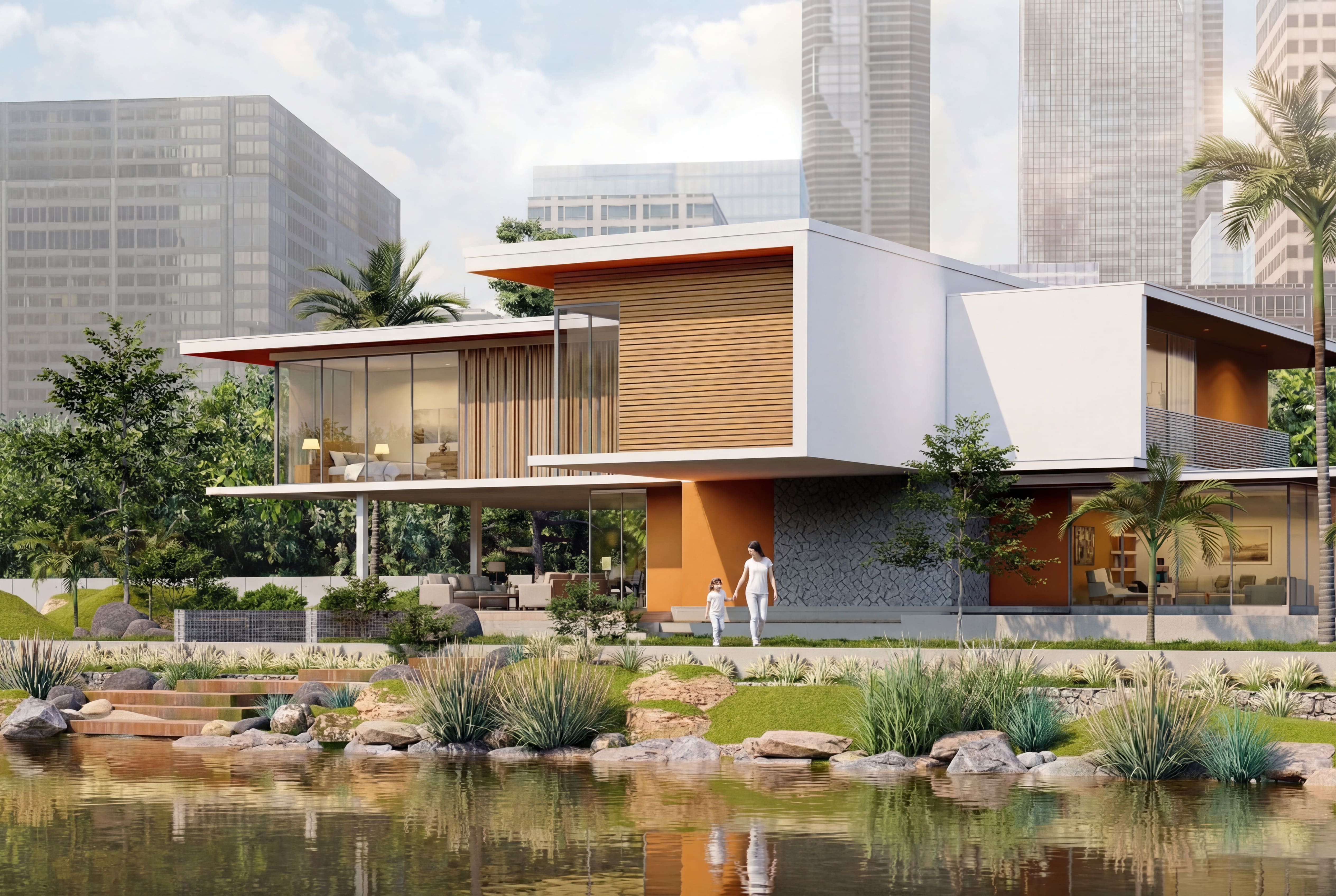 The material palette combines soft neutral tones with natural textures such as wood and stone, enhancing warmth while maintaining a contemporary aesthetic. The overall design reflects a refined living experience where architecture, nature, and lifestyle coexist in harmony.