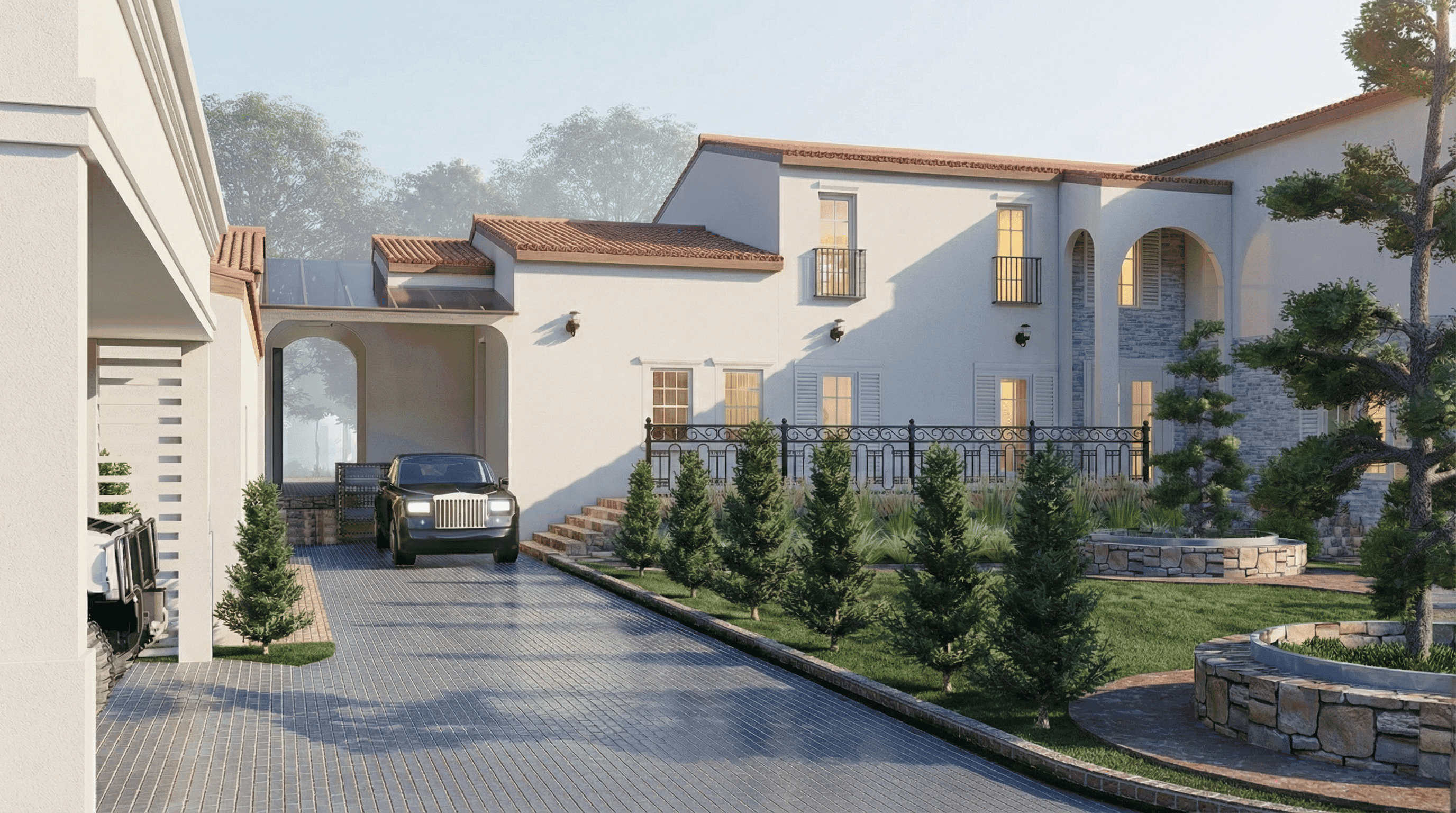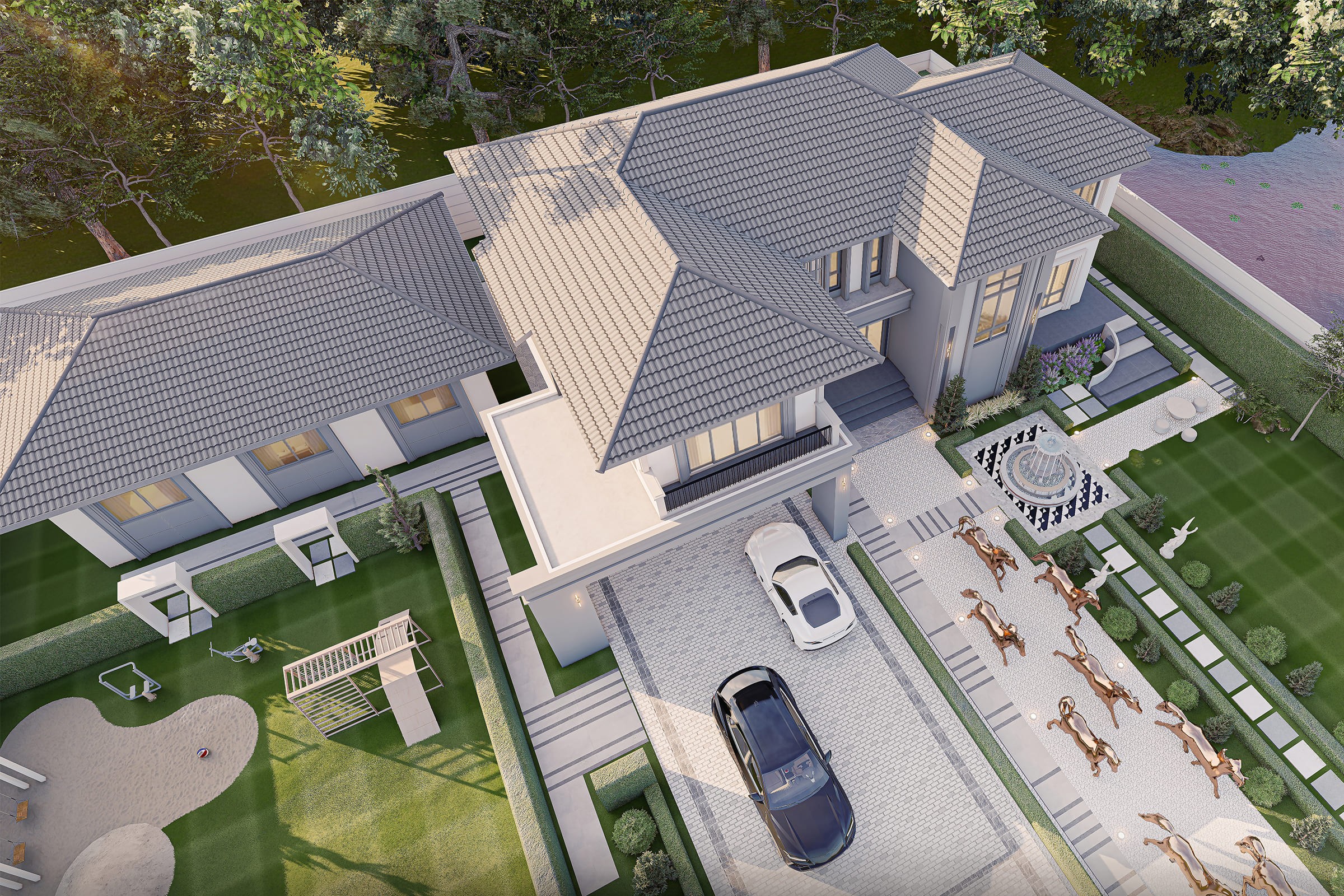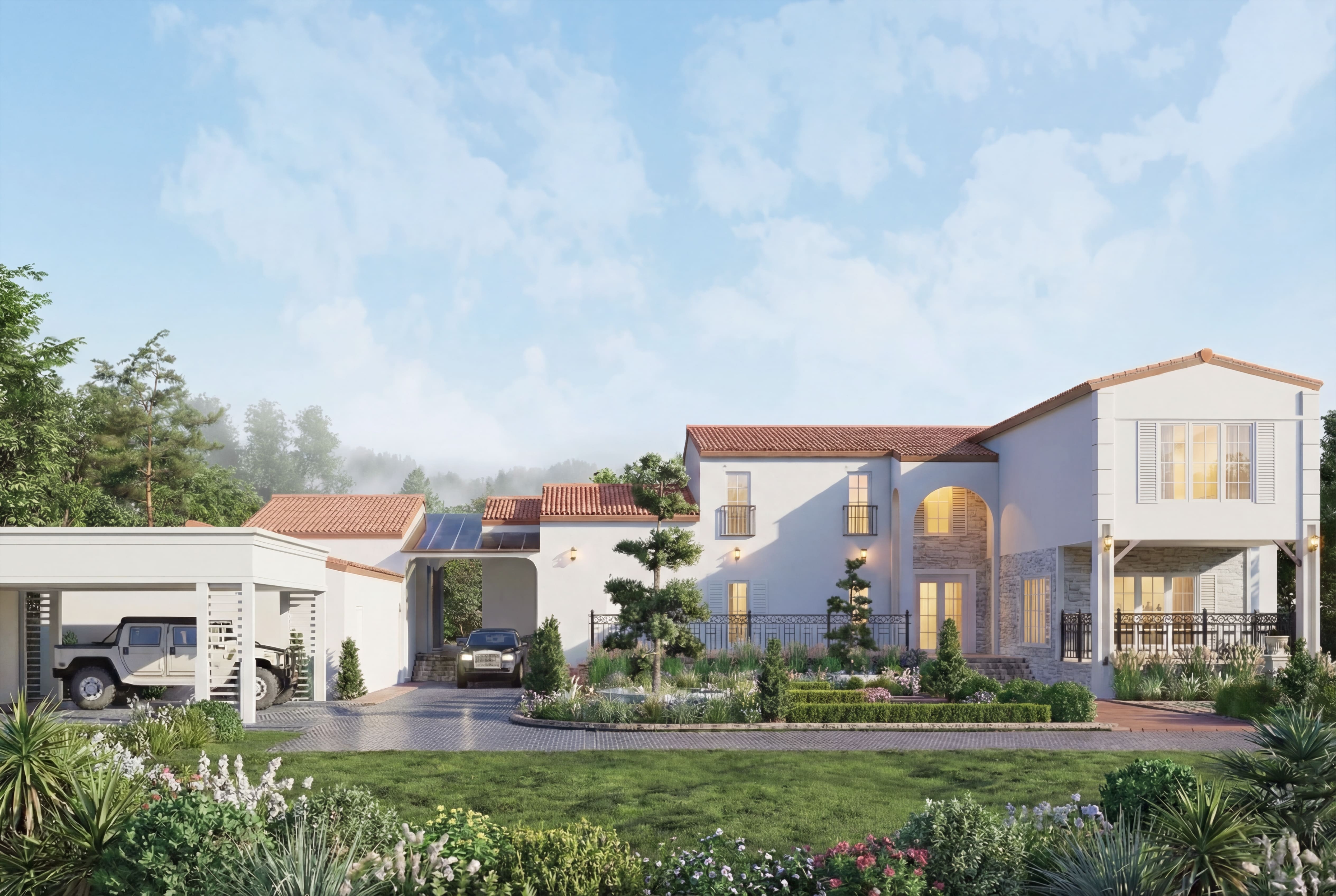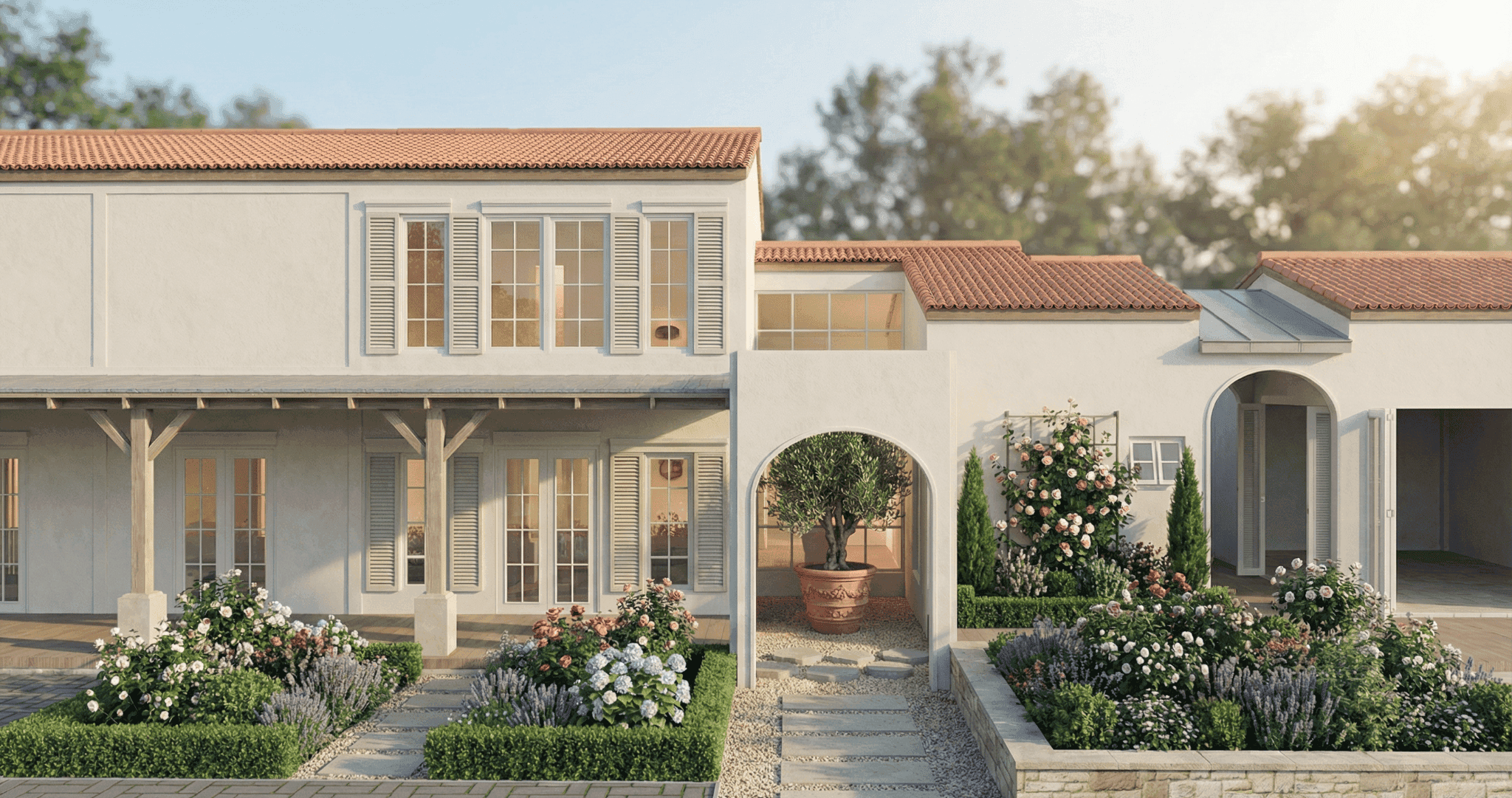 This residence is designed in a Mediterranean–inspired Contemporary style, emphasizing warmth, simplicity, and a relaxed living atmosphere. The architectural composition is arranged as a series of connected volumes with pitched roofs, creating a village-like character that feels welcoming and human-scaled.