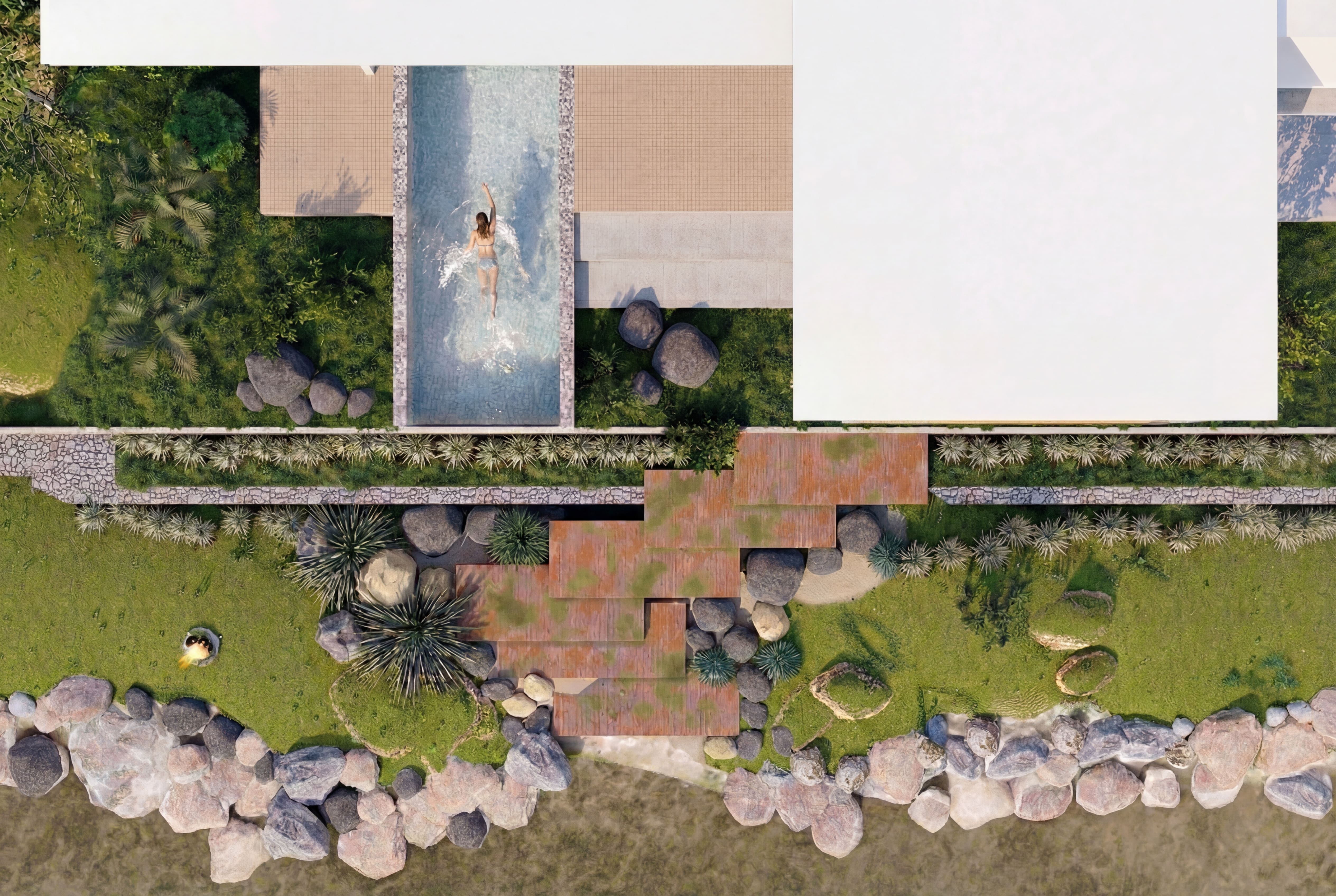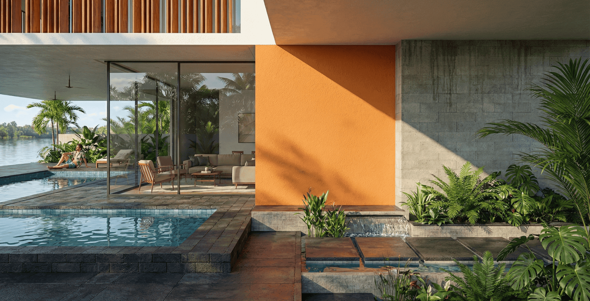 Large glass openings are strategically placed to maximize natural light and visual connection to water and landscape, blurring the boundary between interior and exterior spaces. Deep overhangs and generous balconies provide shade, thermal comfort, and transitional living areas suitable for tropical climates. The material palette combines soft neutral tones with natural textures such as wood and stone, enhancing warmth while maintaining a contemporary aesthetic. The overall design reflects a refined living experience where architecture, nature, and lifestyle coexist in harmony.