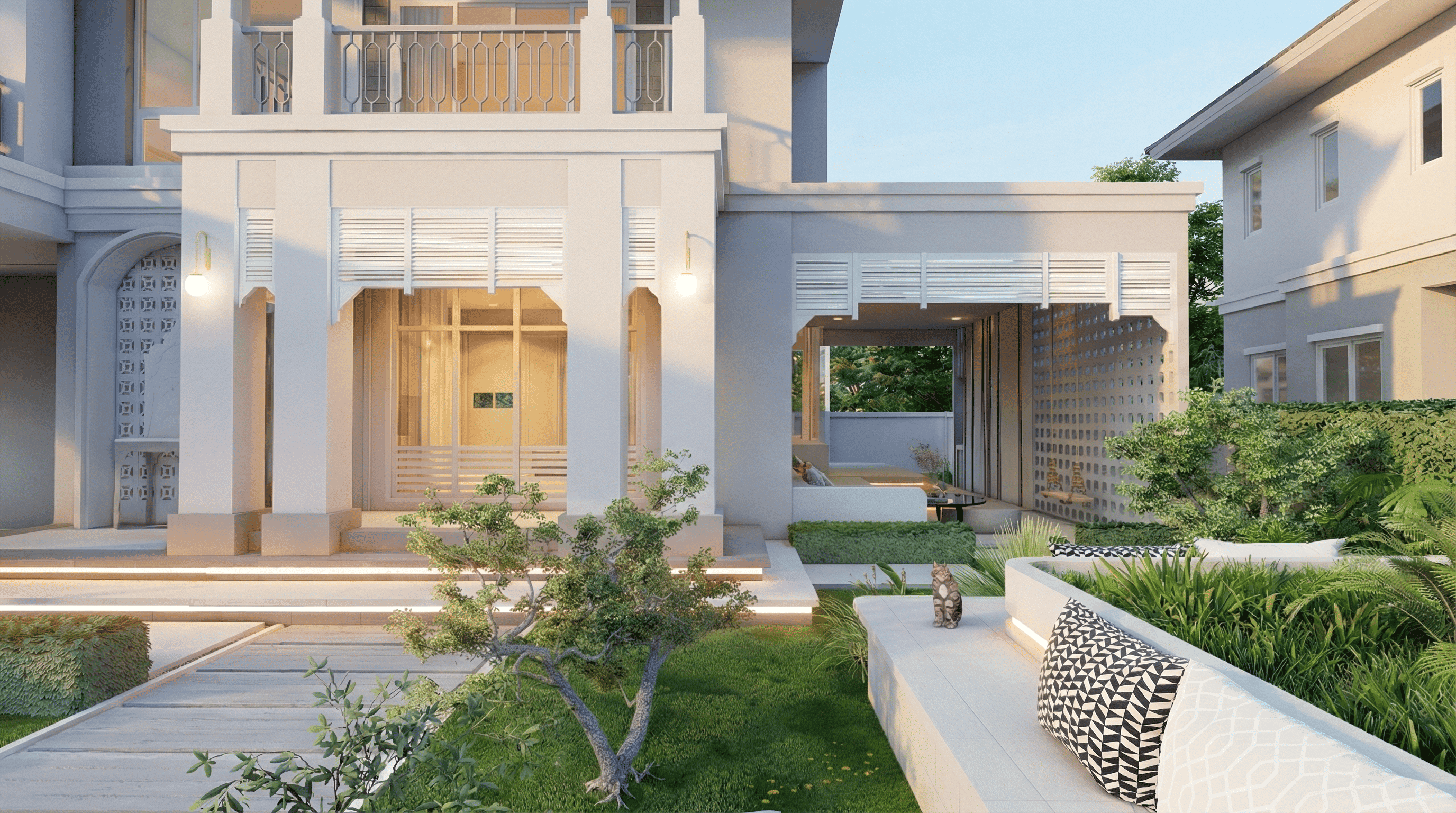 The exterior color palette consists of soft neutral tones, complemented by subtle decorative moldings and clean lines. Landscape elements and a formal garden layout reinforce the architectural symmetry, creating a seamless transition between the building and its surroundings. The design presents a refined residential environment that conveys luxury, stability, and timeless elegance.